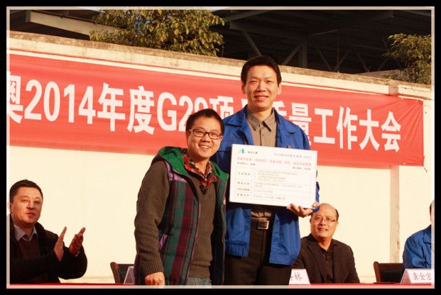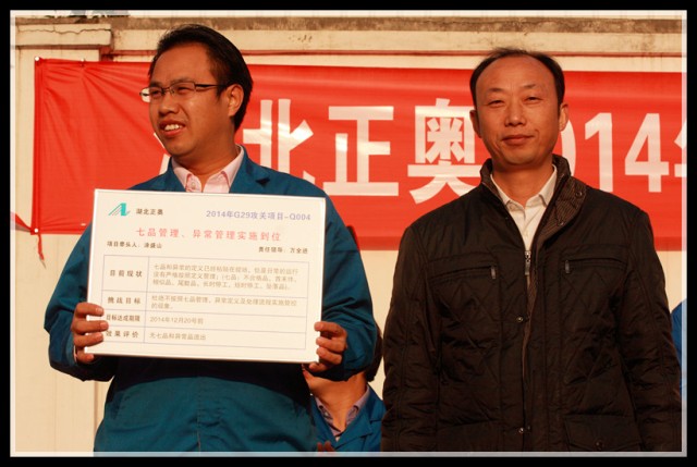 到會(huì)領(lǐng)導(dǎo)為G29項(xiàng)目組成員頒發(fā)了戰(zhàn)表,為下一階段的改善制定新的挑戰(zhàn)目標(biāo),全體員工見證了這一重要時(shí)刻,并在會(huì)議現(xiàn)場(chǎng)用熱烈的掌聲表達(dá)了完成任務(wù)的信心和決心。